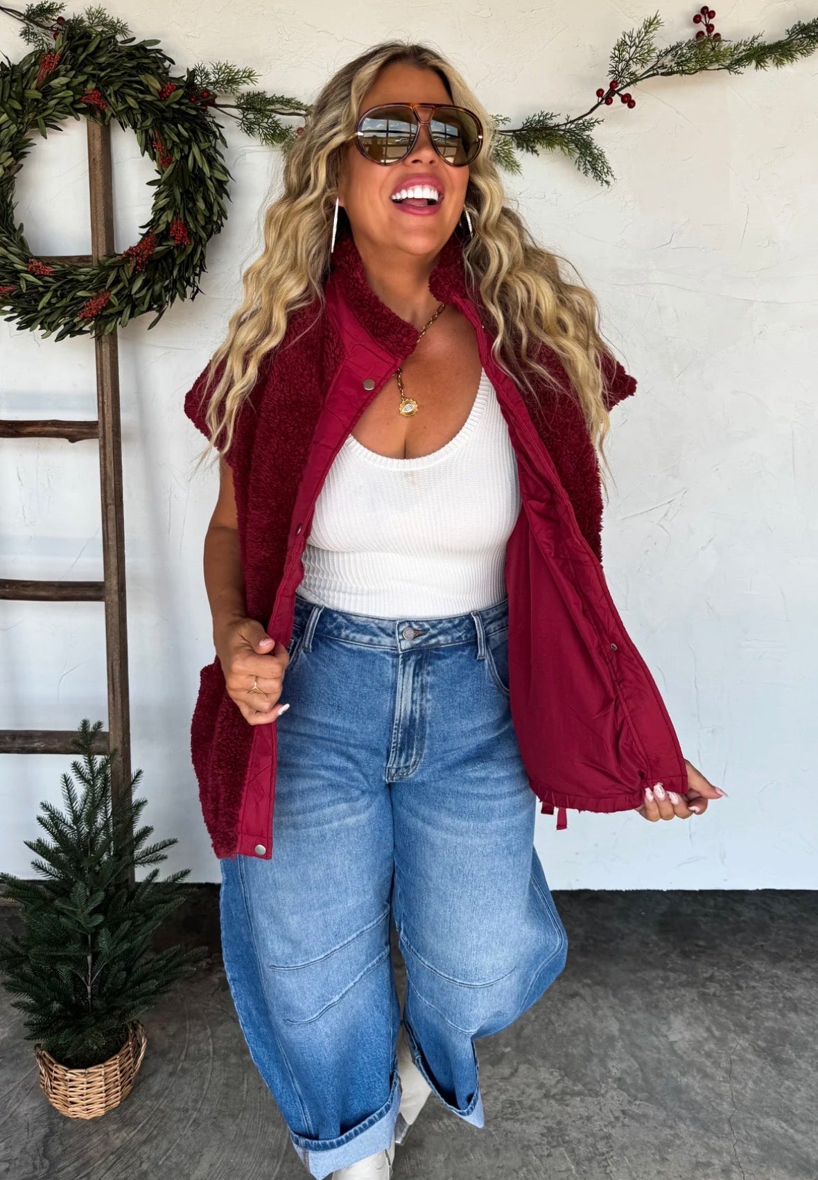 These stylish vests feature bold colors and prints in soft, plush faux fur sherpa, giving it a cozy and luxurious look. It has a high collar and longer cap sleeve design with snap button closures down the front. Also features side pockets and side tie strings for cinching or wearing shorter if preferred. Perfect for layering, it adds a fun, fashionable edge to any outfit.