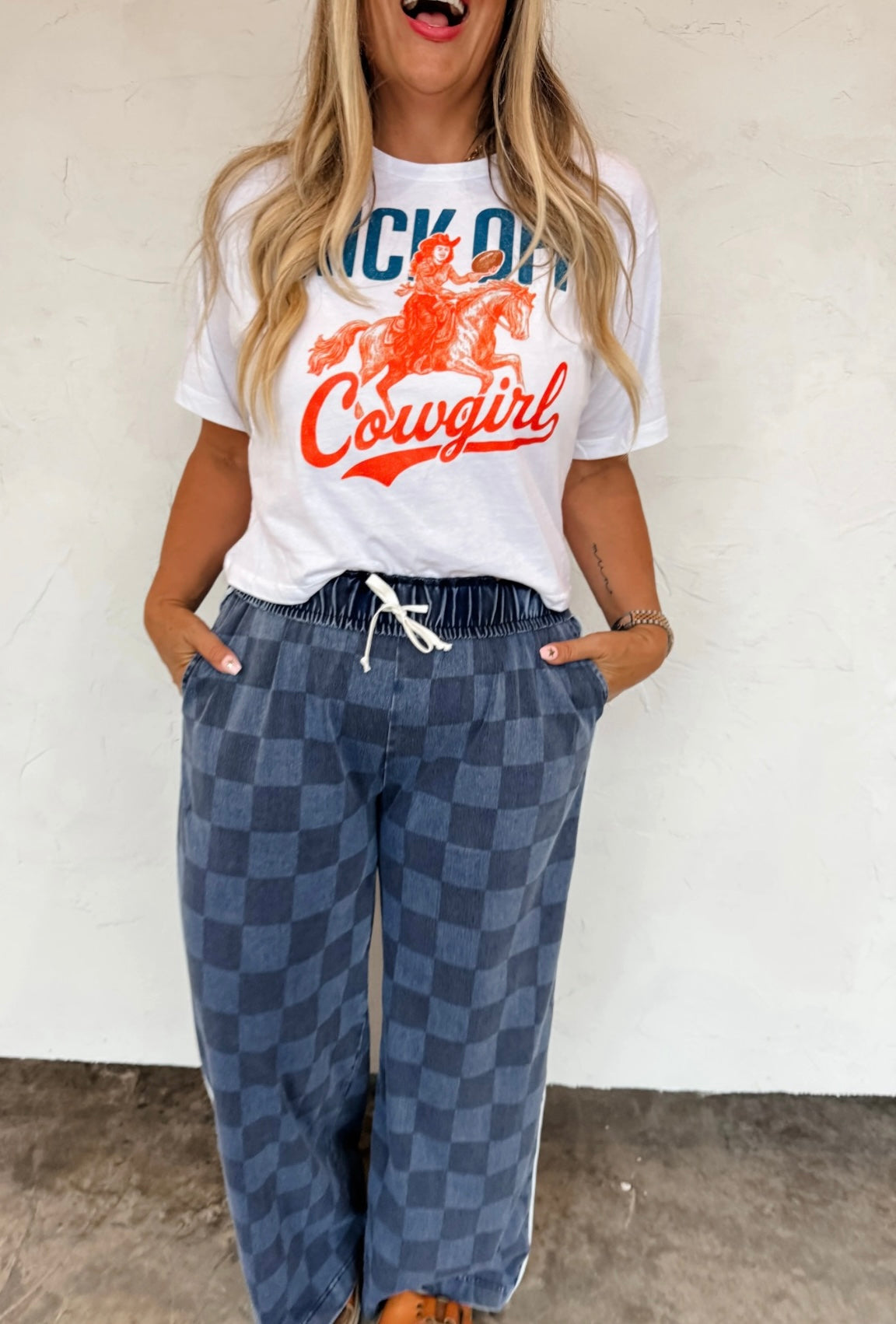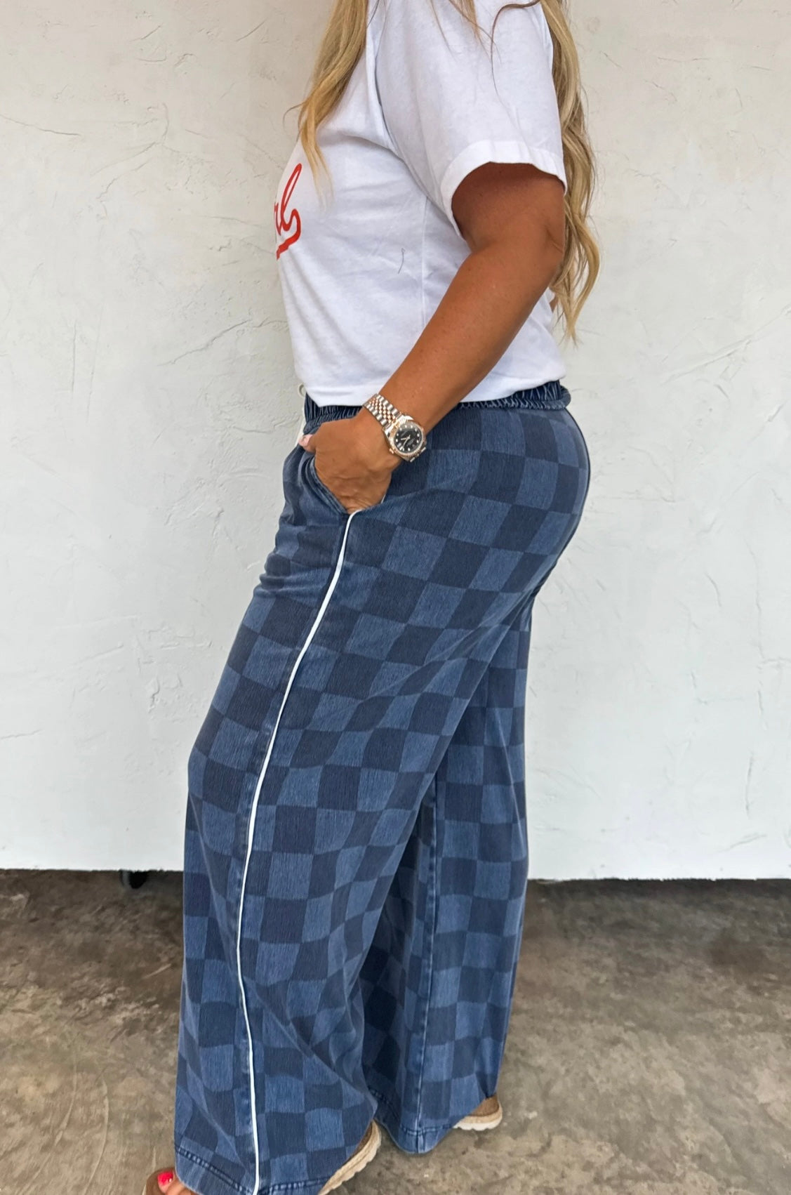 These STRETCHY wide-leg denim pants feature a trendy checkerboard denim print with a relaxed, easy fit that’s perfect for everyday wear. Designed with an elastic waistband and an adjustable tie string, they can be worn high-waisted or folded down to reveal the tie detail for a more casual vibe. The lightweight stretchy denim feel makes them versatile for year-round styling, while the full-length cut with raw-style hem and subtle white pinstripe side seam detail add the perfect finishing touch.