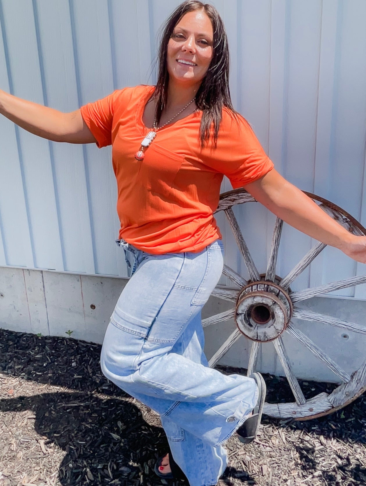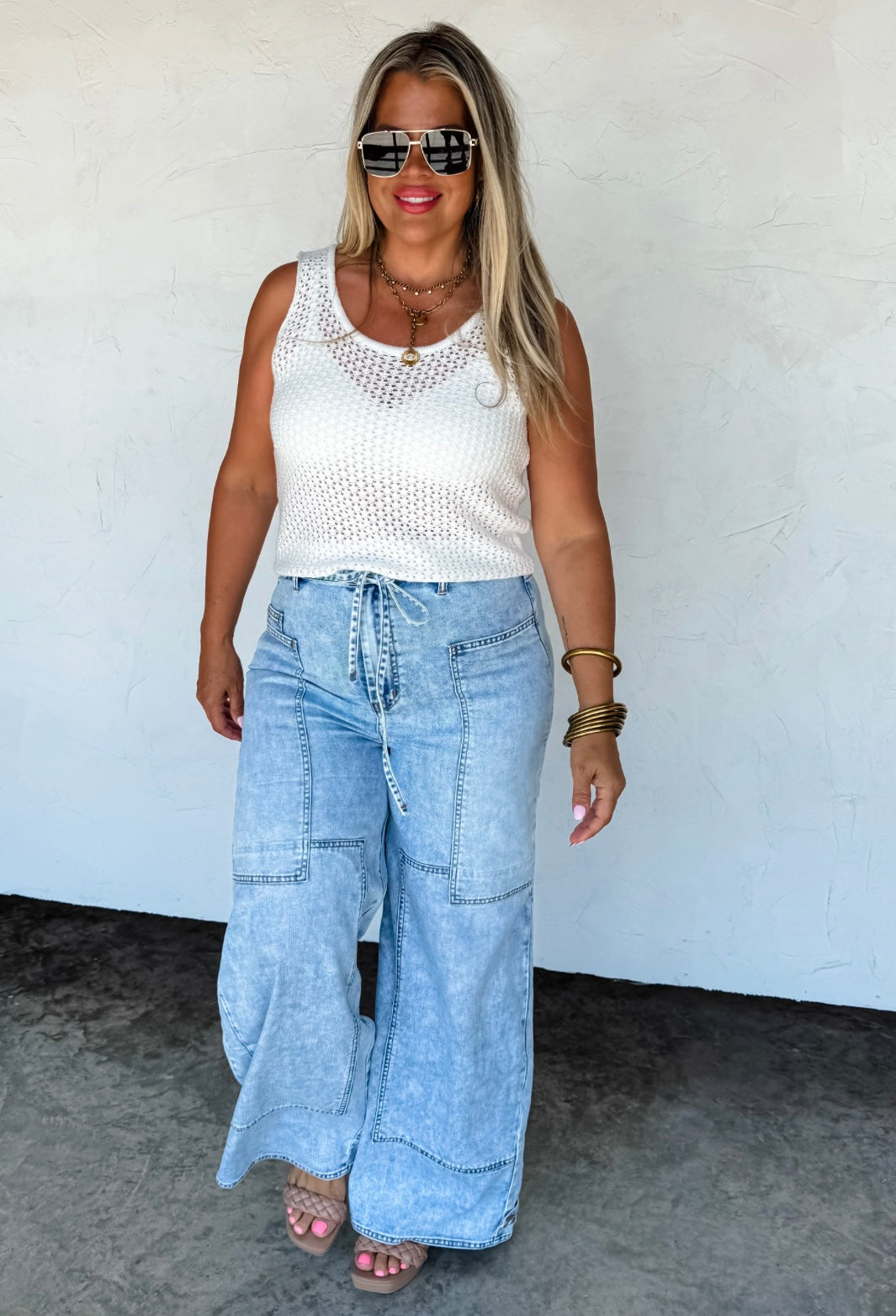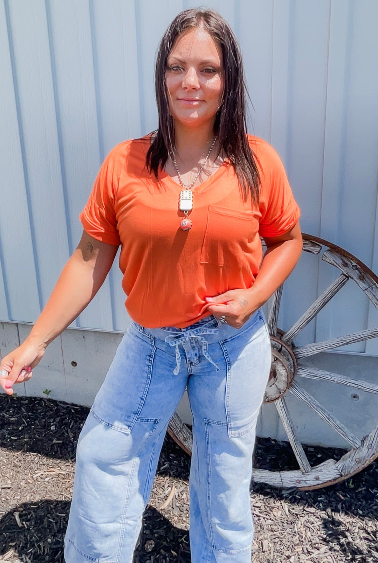 These cute large panel pocket jeans are just the right vibe for Summer! Cool and easy to wear! A cute tie waist add just the right touch! Semi high waisted, stretch and such a cute boho look!