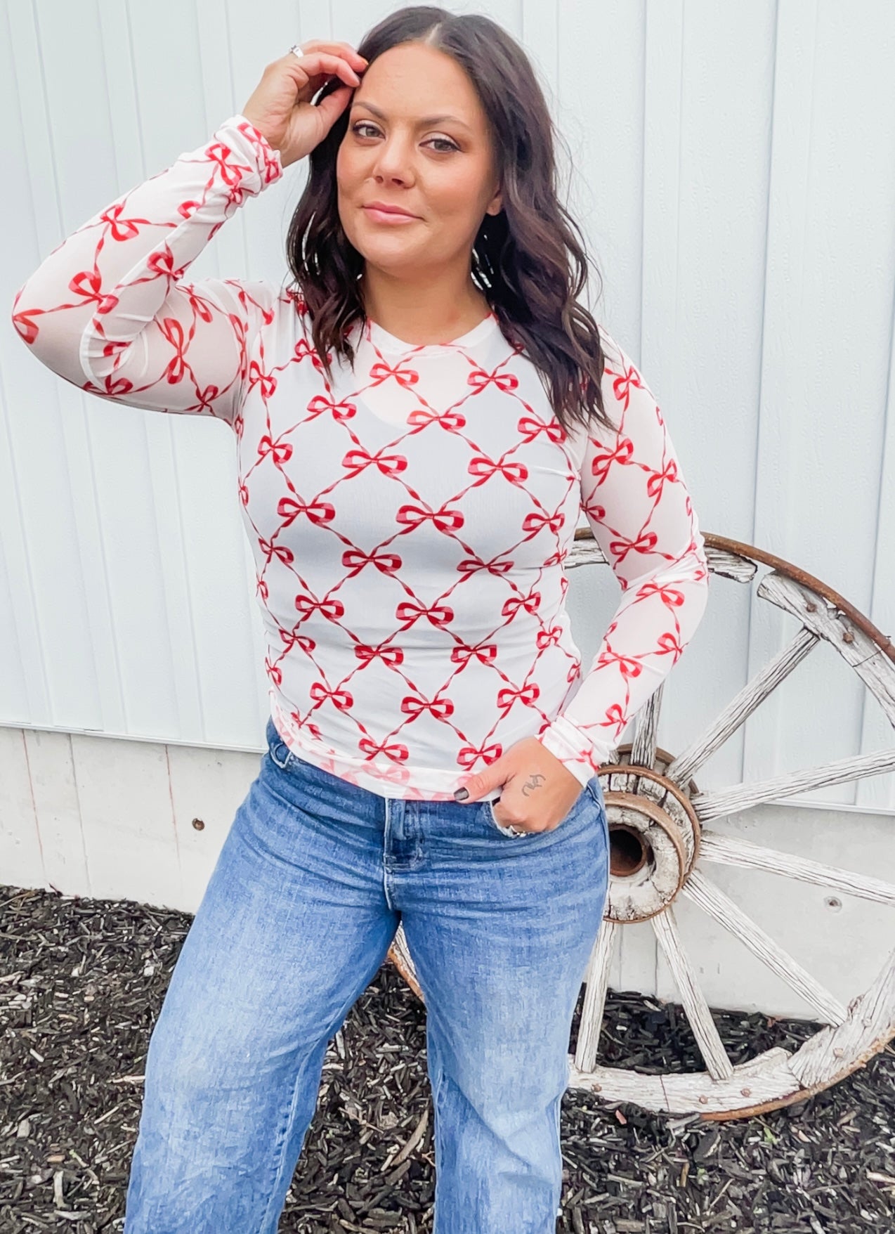 Super cute for layering! Stretchy mesh print long-sleeve top features a totally sheerdesign. Perfect worn alone or paired under your favorite cardigan, vest or sweater! Crew neck and thumbhole detail sleeves.