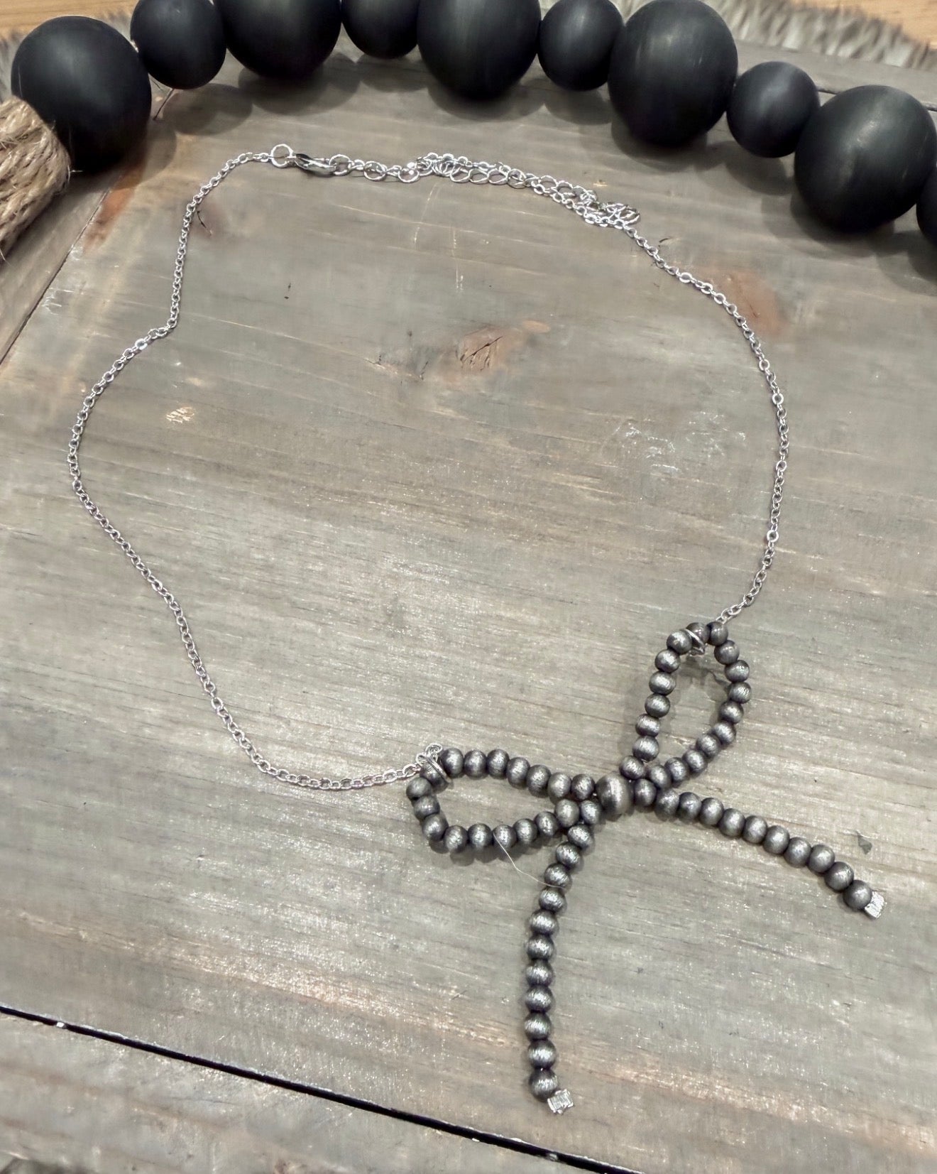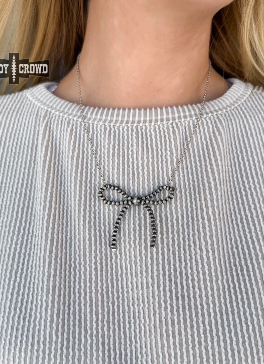The viral pearl bow necklace is here! Our Cowgirl Pearls Necklace is sterling silver featuring elegant Navajo pearls shaped like a bow.  This necklace truly captures the elegance and grace of the Wild West. Accent your blouses or pair it with your favorite jacket (like the Lawless jacket) for a laid back, stylish look.