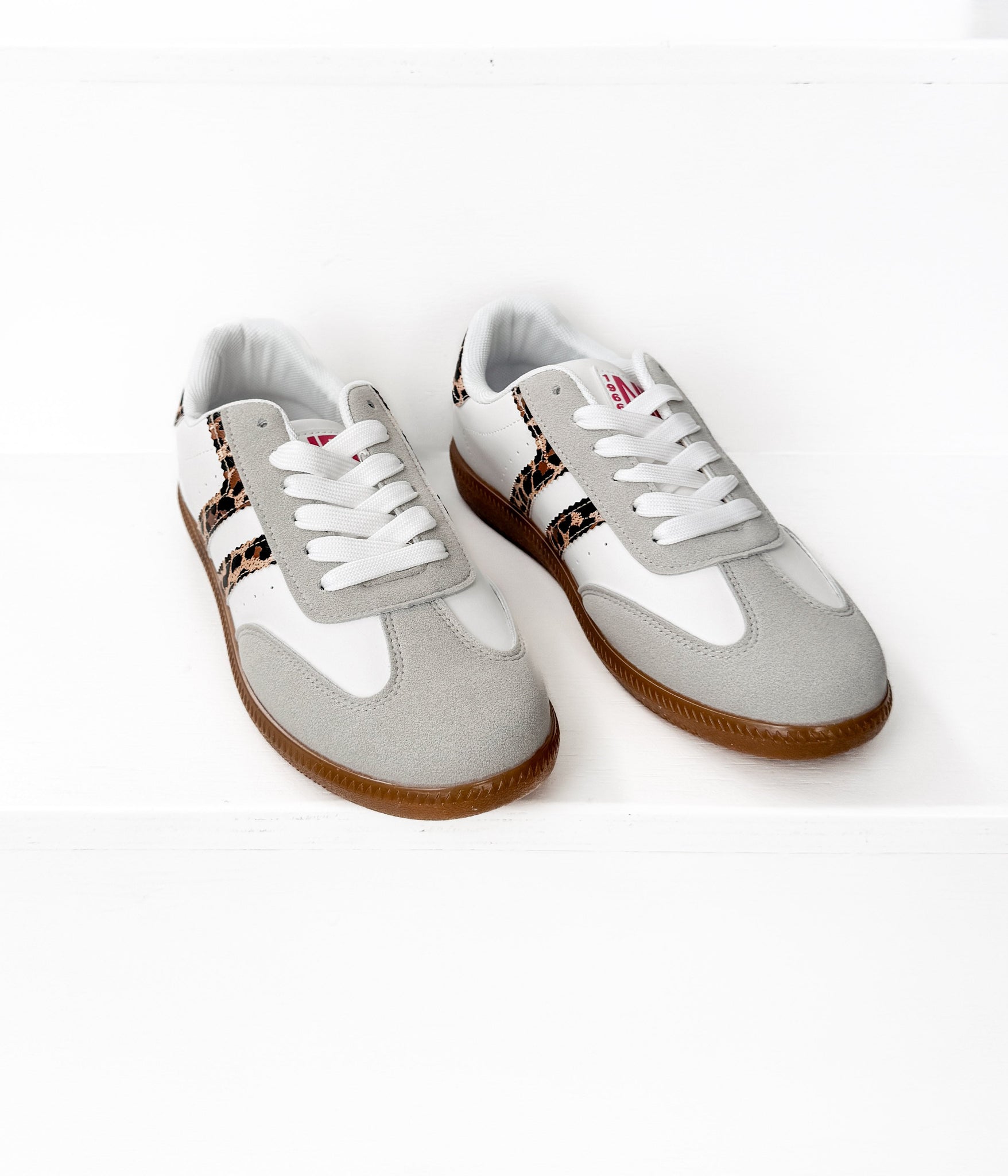 Meet your new go-to pair for everyday style with a hint of sass. The Stockholm White Sneakers blend crisp white faux leather with soft gray suede accents, while a metallic leopard detail at the heel and sides adds that perfect touch of bold charm.
