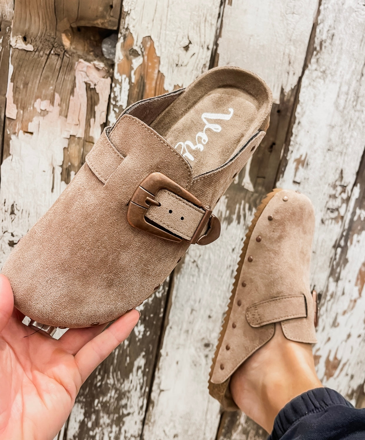 Light-weight suede and buckle details with studs along the bottom and molded footbeds.