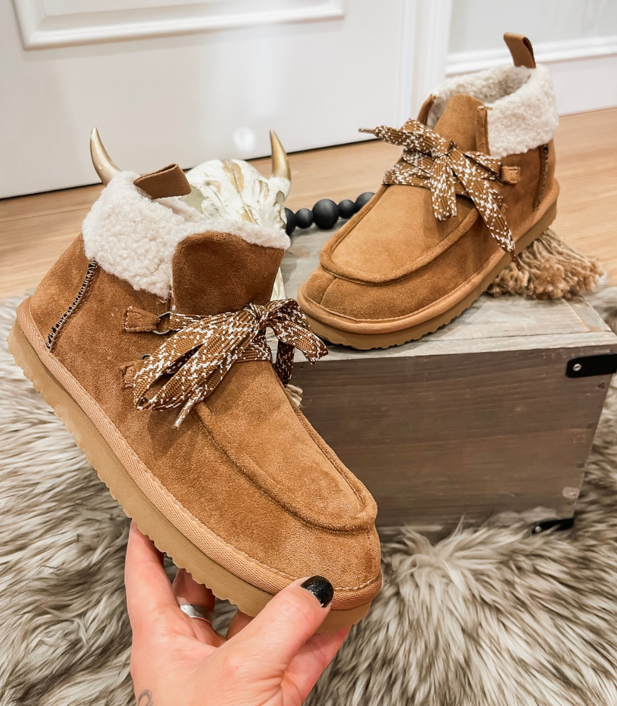 Light-weight rubber sole, suede material on the outside, and soft faux fur lining along the top with cute laces
