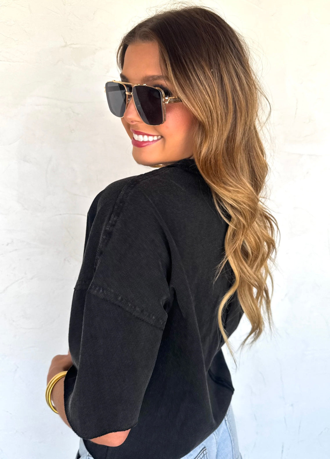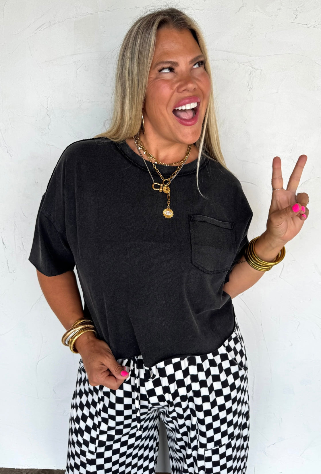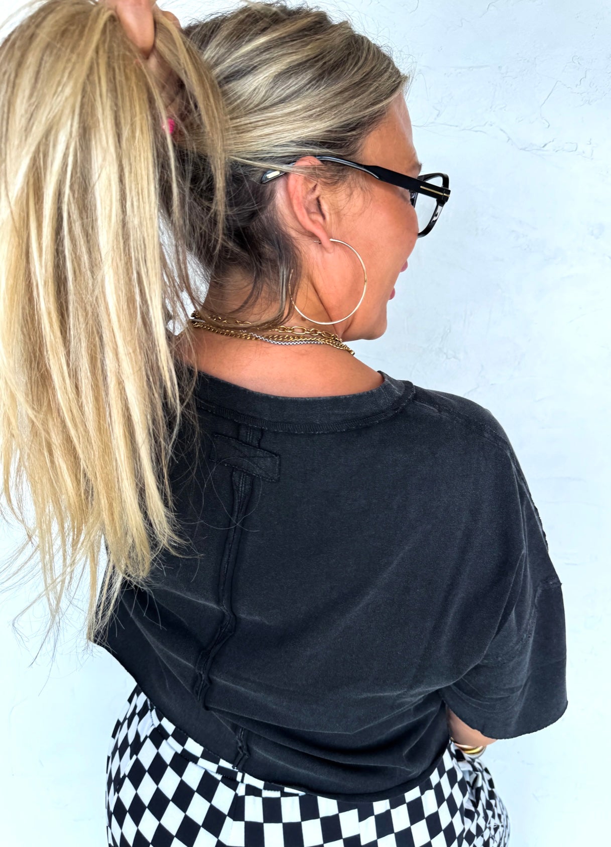 The perfect washed cotton, boyfriend tee that everyone needs! Features a raw, pocket and seam detailing on the back!