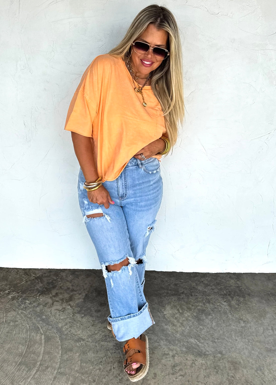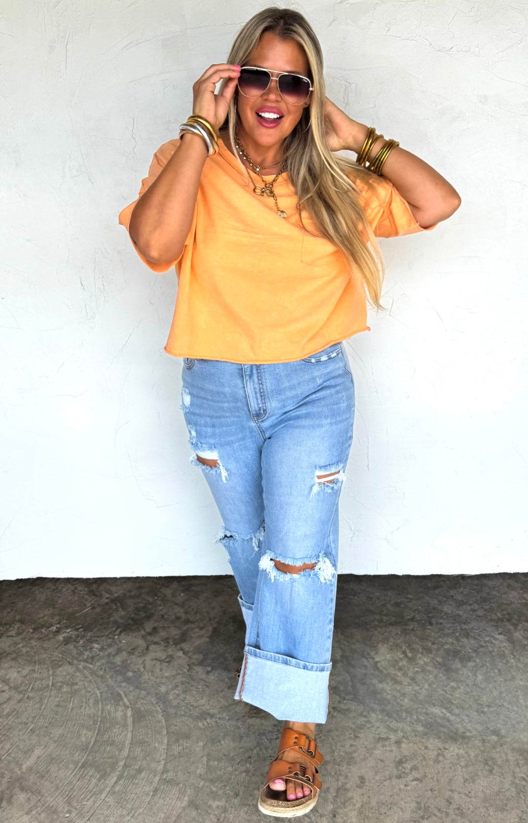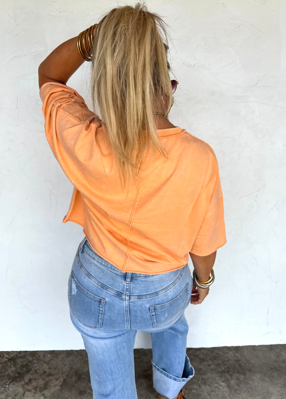 The perfect washed cotton, boyfriend tee that everyone needs! Features a raw, pocket and seam detailing on the back!