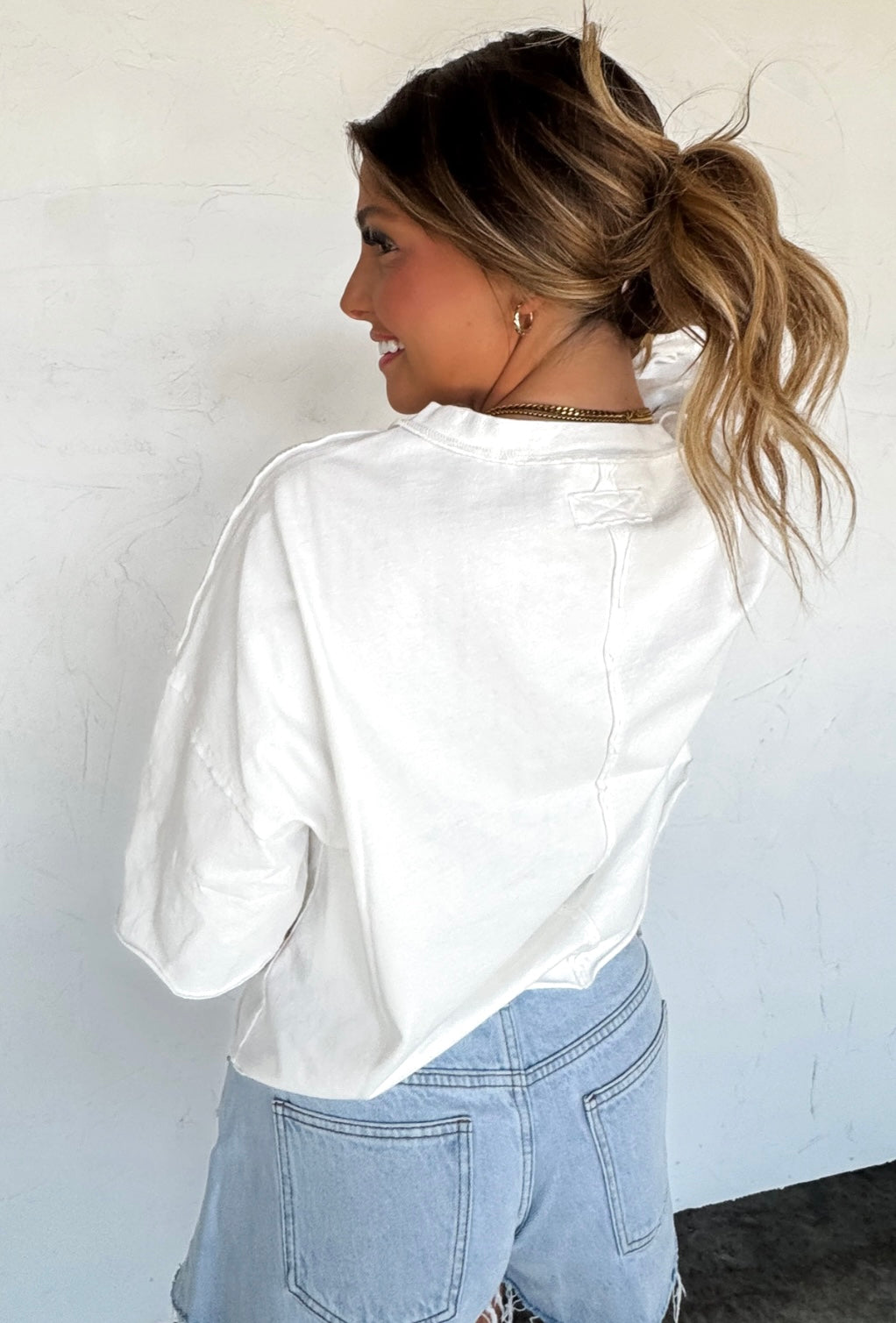 The perfect washed cotton, boyfriend tee that everyone needs! Features a raw, pocket and seam detailing on the back!
